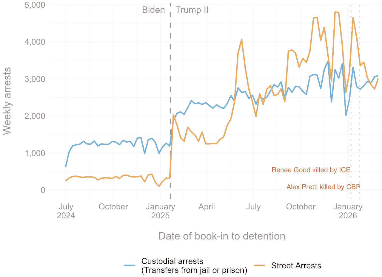 “First, ICE arrests quadrupled, including both street arrests and transfers from criminal custody to ICE immigration custody. ICE street arrests (i.e. arrests not at jails) went up by over a factor of eleven. Street arrests at this order of magnitude are a new phenomenon. For both types of arrests, ICE was much less likely to target people with criminal convictions. These changes led to over a sevenfold increase in arrests of people without criminal convictions.”—Deportation Data Project